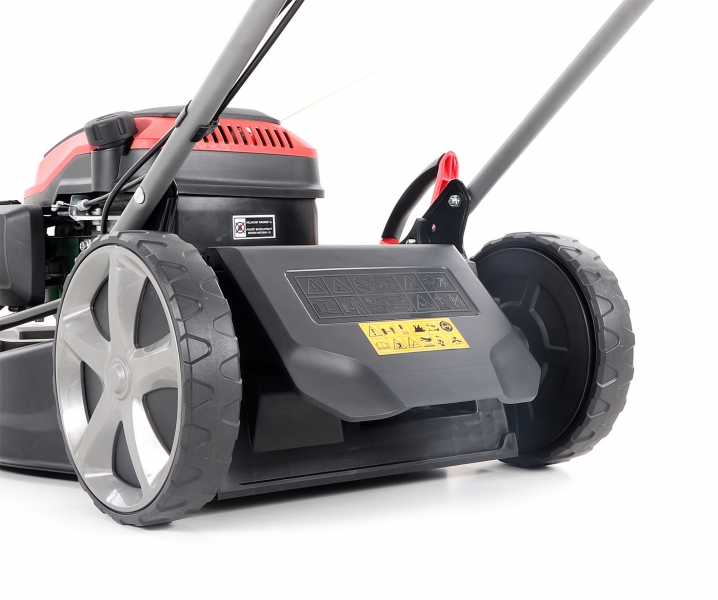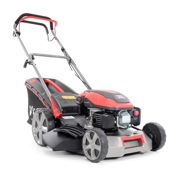Velká zadní pojezdová kola i přední kola jsou uložena v oboustranných kuličkových ložiscích, centrální nastavení výšky sečení je u značky VeGA také samozřejmostí, jako ergonomické měkčené madlo.