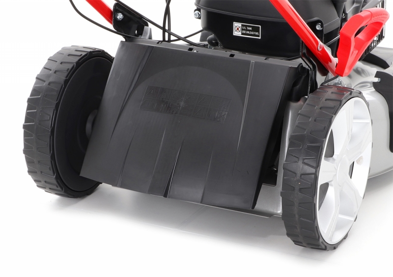 V extrémních podmínkách je možné otevřít kryt na straně šasi a nasadit deflektor bočního výhozu. Je to obzvláště efektivní, pokud máte vysokou, mokrou trávu. Výšku střihu trávníku můžete pohodlně zvolit pomocí samostatné páky centrálního nastavení výšky.